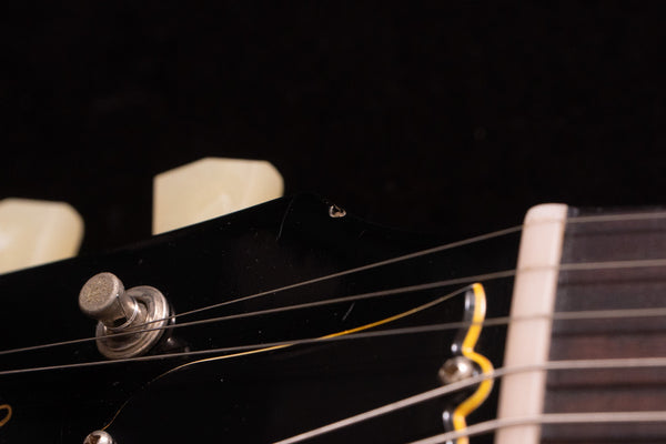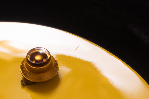 It boasts a unique, commanding presence with its Canary Yellow finish—reminiscent of Ferrari yellow and inherited from the original—paired with black binding and an abalone inlay on the fingerboard.