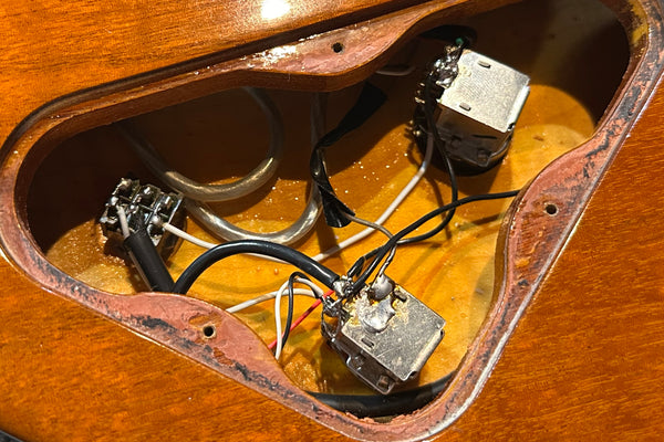 The controls have been modified to 2 volume knobs and a 3-way toggle switch. Switch pots are installed, enabling coil tapping on the pickups.