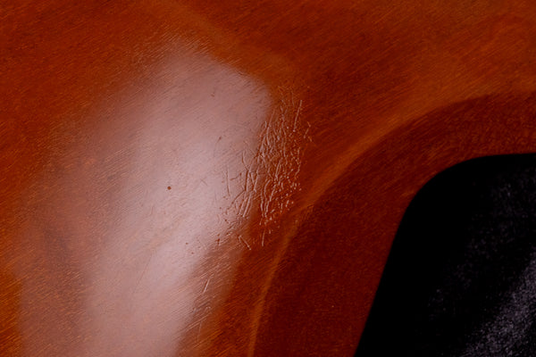 There is a linear scratch on the 6-string side cutaway of the body top, and stroke marks are visible near the neck pickup.