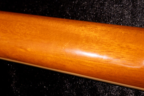 The headstock top has a scratch near the logo, paint loss near the 4th string peg, and impact marks near the 3rd and 6th string pegs.