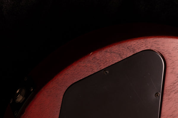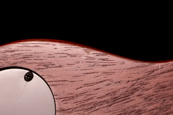 The body back has scratches near the selector panel, the 1st string cutaway, the control panel, and the end pin.