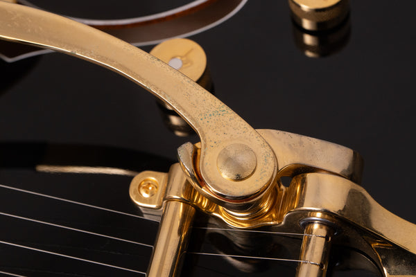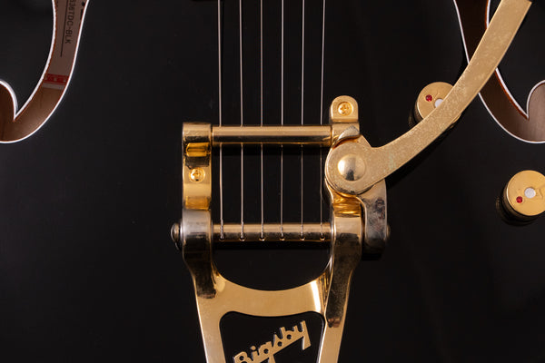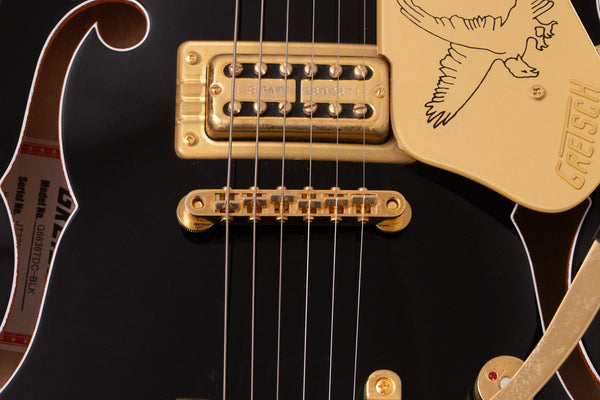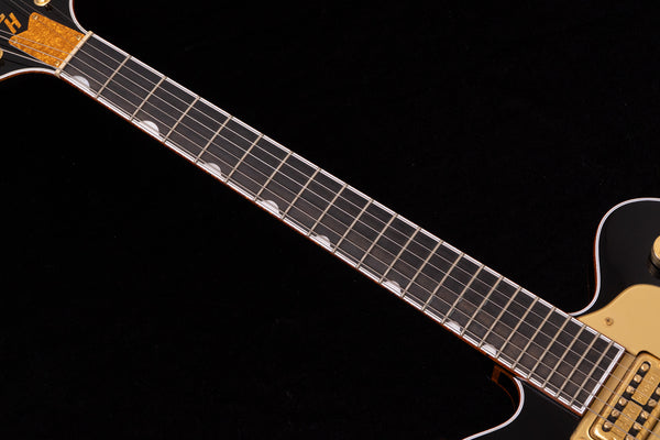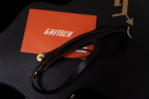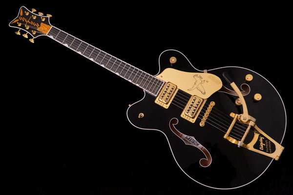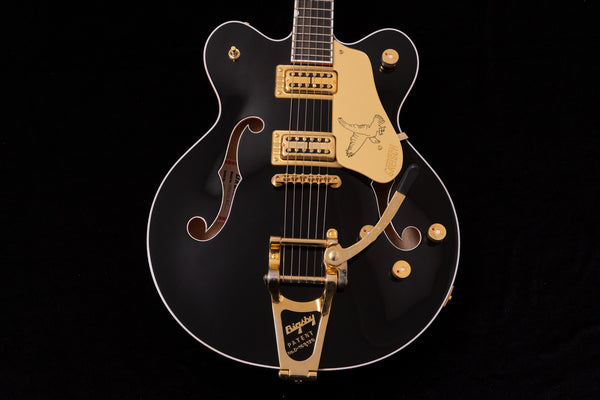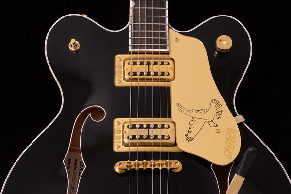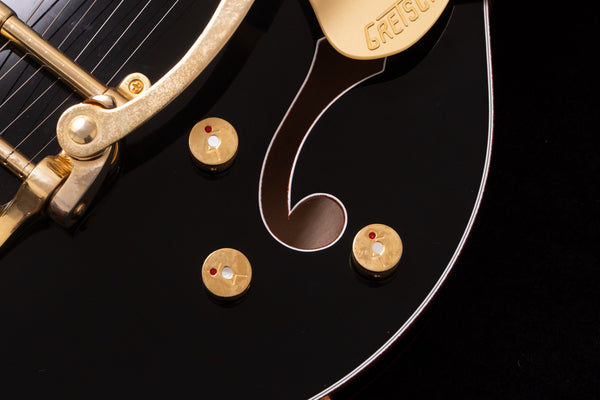 The black body and gold hardware create a unified, gorgeous look characteristic of Gretsch guitars.