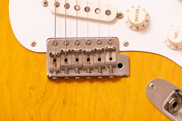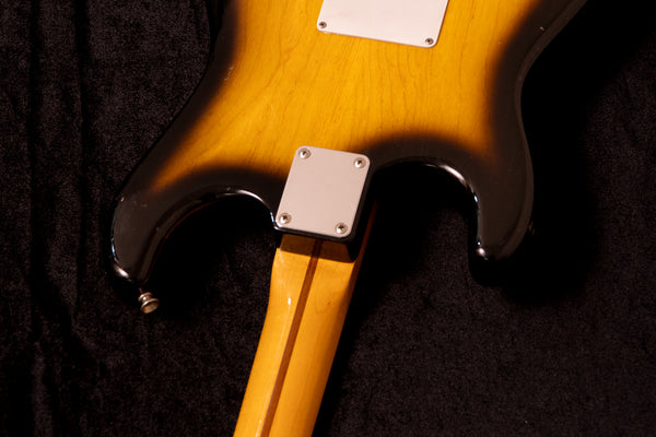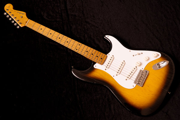 The two-tone sunburst finish highlights the flowing Ash grain, paired with a white pickguard and round string guides, evoking the look of the first-year Stratocaster.