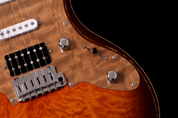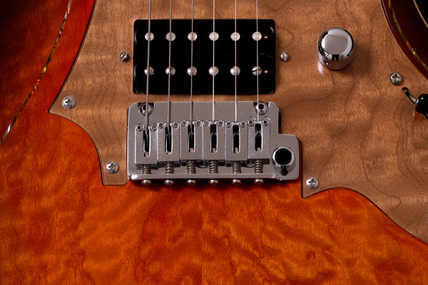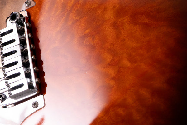 The body back is 1-piece Alder, while the top is exceptionally thick 5A-grade Quilted Maple.