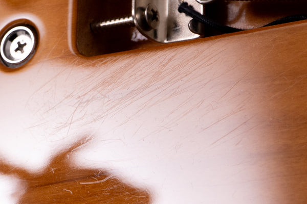 Impact marks are present on the binding near the endpin, and there is a scratch on the elbow section of the body side.