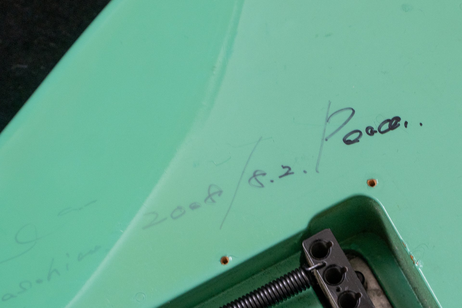 The body back has written text and rust-like brown discoloration.
