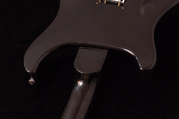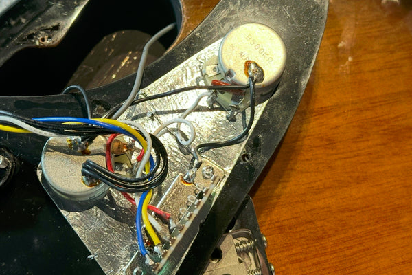 The body and finish show signs of use, and the pickguard has scattered scuffs. Scratches are also present near the selector switch on the body top and the elbow contour area, along with other minor scuffs. There are two scratches near the jack on the body side and a scratch near the neck joint on the body back.