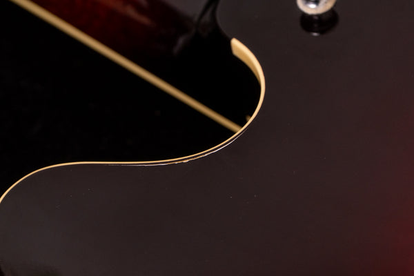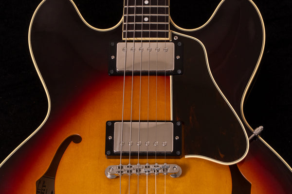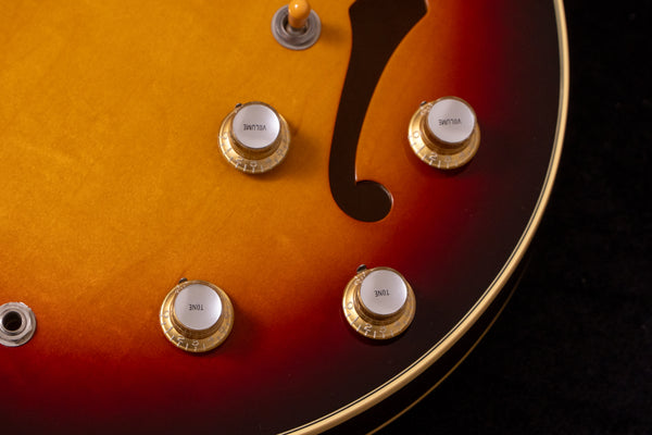 Inside the body, the central section where the pickups and bridge are mounted is solid wood, known as the center block. The sides are hollow, featuring violin-style F-holes.