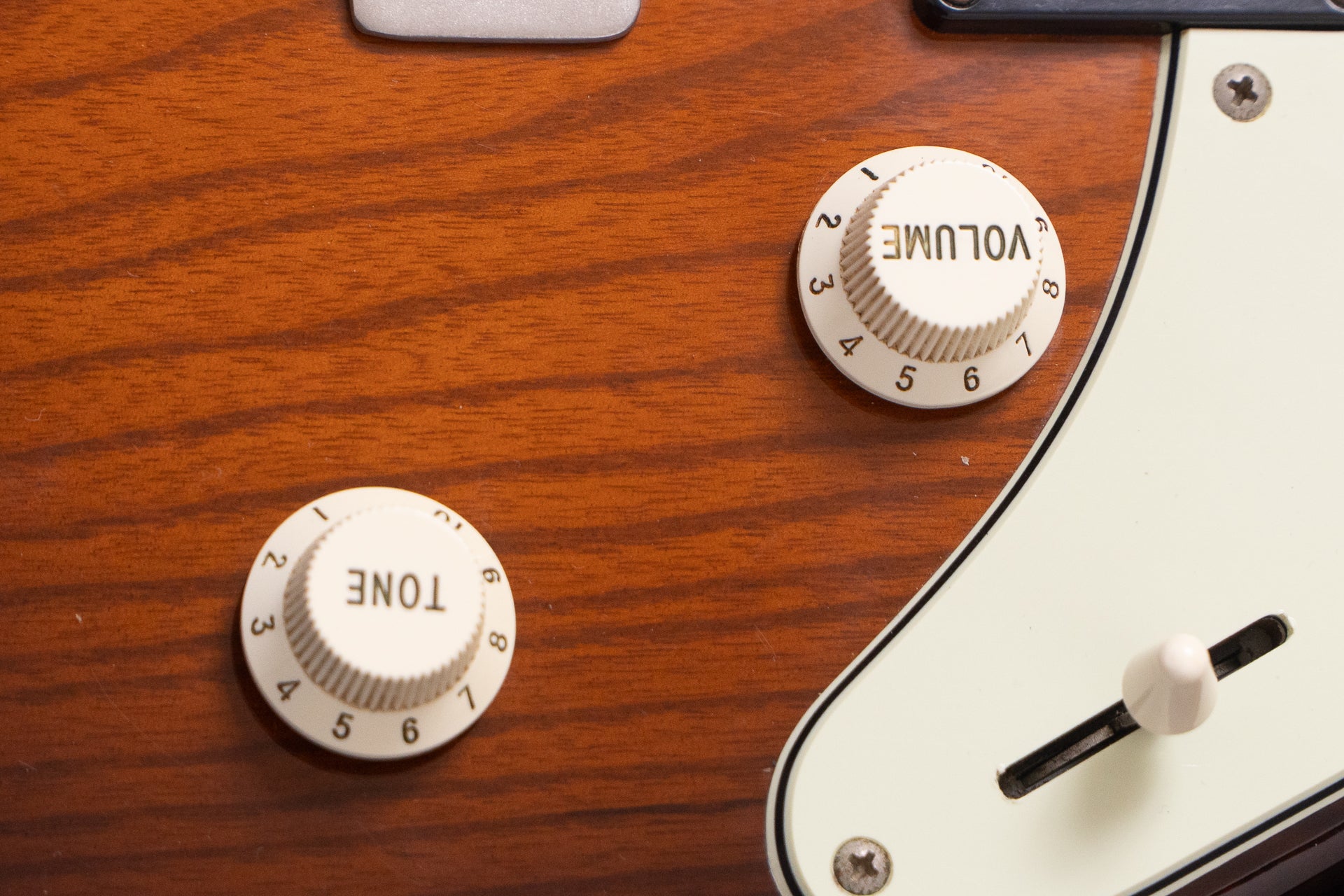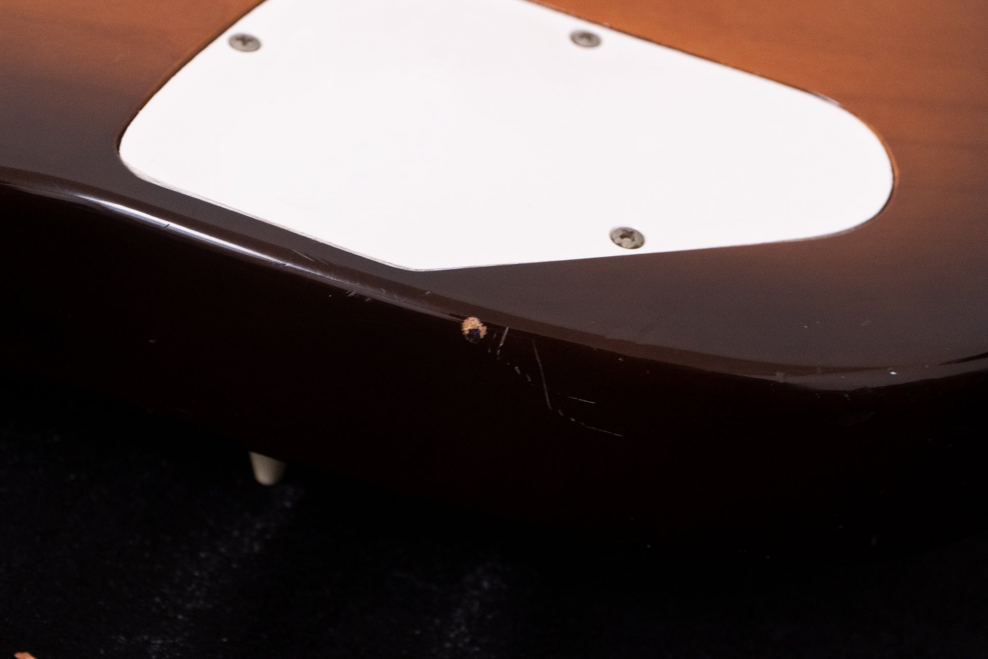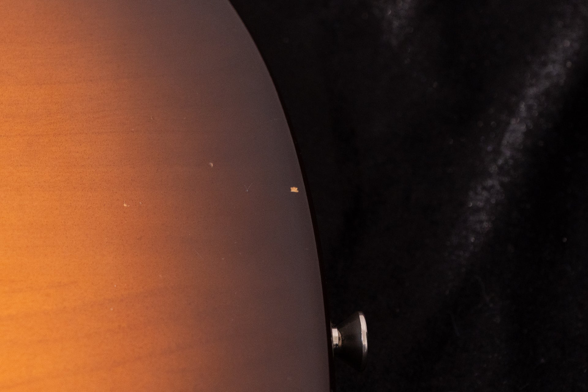 There is a scratch on the neck pickup, a chip near the elbow contour on the body top, and distortion on the locking mechanism of the 5th string peg.