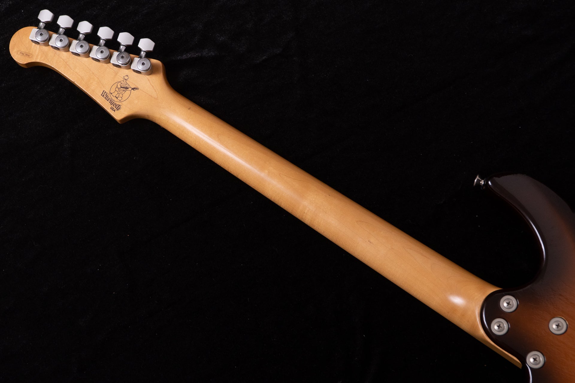 It features Schaller locking tuners and an original two-point tremolo unit for smooth arm action.